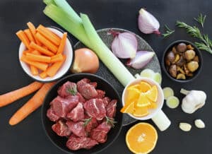- בסוטאז’ רחב (רצוי כזה שיכול להיכנס לתנור) מחממים על להבה גבוהה מעט שמן לטיגון, וצורבים את קוביות הבשר מכל הצדדים כ-5 דקות להשחמה קלה. מוציאים הצידה.