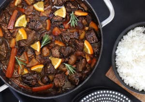 תבשיל בשר עם ירקות שורש, ערמונים ופירות יבשים, ברוטב מתקתק