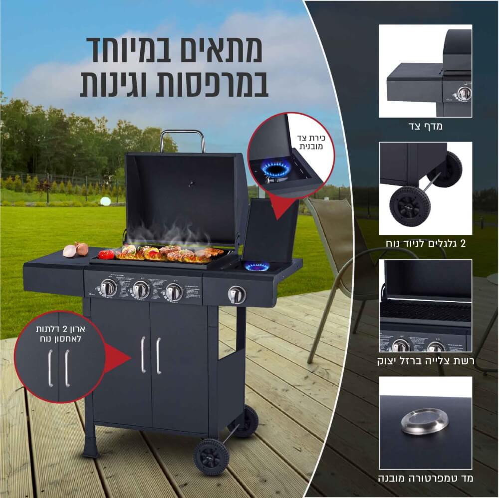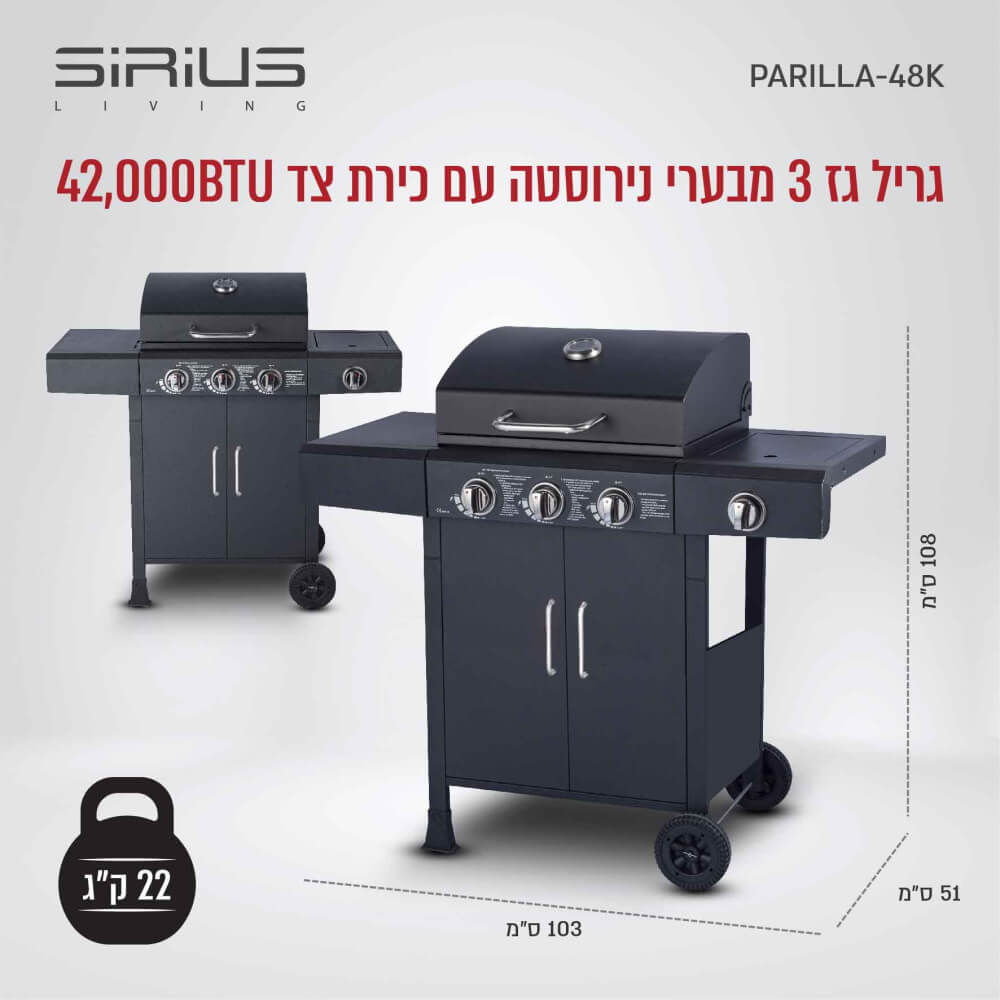 גריל גז 3 מבערי נירוסטה עם כירת צד SIRIUS-LIVING סיריוס ליוינג דגם PARILLA-48K