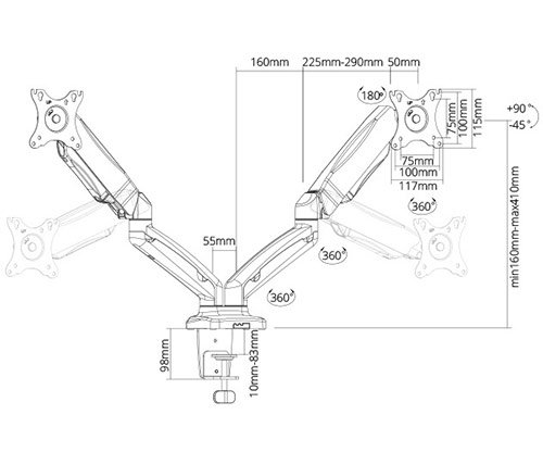 זרוע שולחנית 4 תנועות שיח ל-2 מסכים בגודל עד “27 דגם MO2 Sih