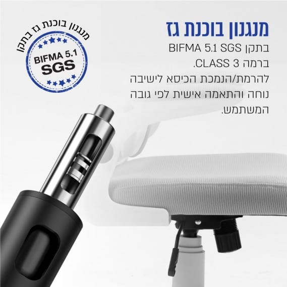 מכניקה מנגנון בוכנת גז בתקן  BIFMA 5.1 SGSברמה 3 CLASSלהרמת/הנמכת הכיסא לישיבה נוחה והתאמה אישית לפי גובה המשתמש