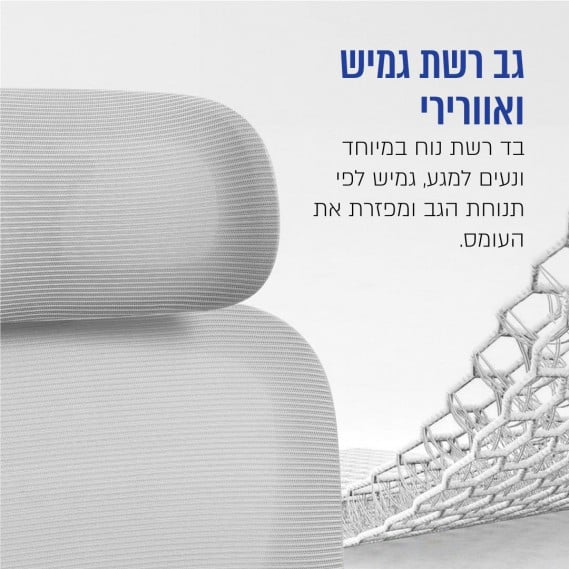 גב רשת גמיש ואוורירי בד רשת נוח במיוחד ונעים למגע, גמיש לפי תנוחת הגב ומפזרת את העומס