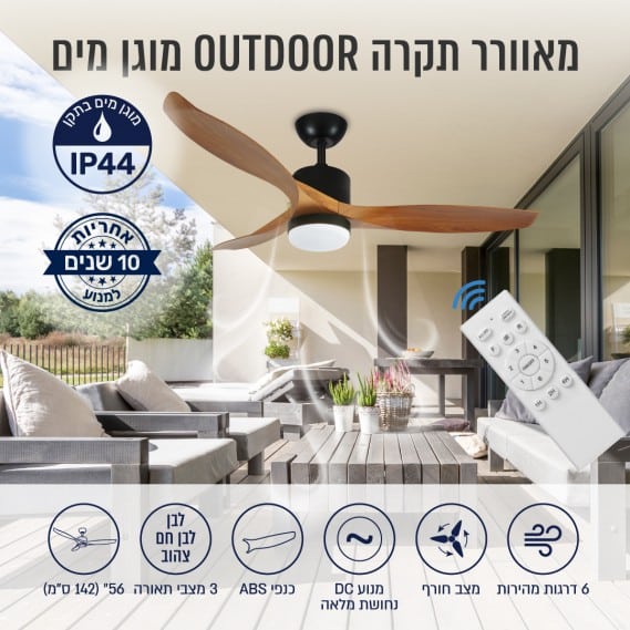 מוגן מים- מאוורר זה מגיע בתקן IP44 להתקנה במרפסות ופרגולות בלי חשש מפגיעה של המוצר בעת שנוגע במקור מים