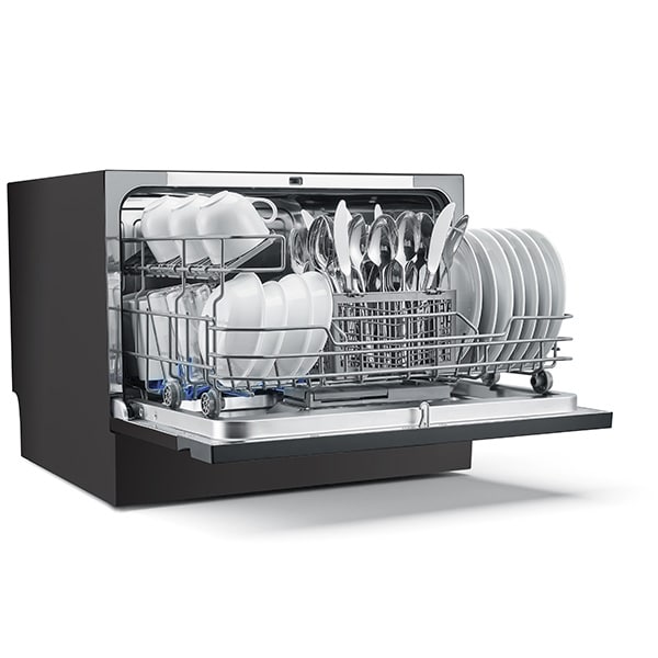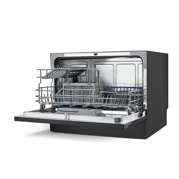 מדיח כלים קומפקטי לשימוש על משטח השיש במטבח.