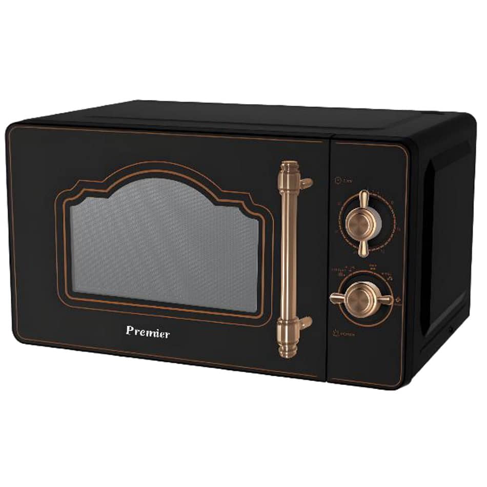 Premier PM203B – מיקרוגל מכני 20 ליטר בצבע שחור בעיצוב כפרי, קל לתפעול, אידיאלי לחימום והפשרת מזון במהירות ובנוחות.
