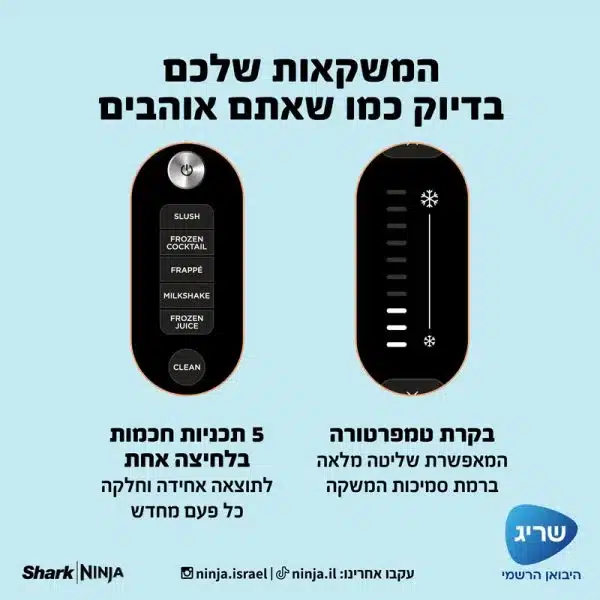 Frozen Juice (מיץ קפוא) – למיצים ממותקים באופן טבעי - שליטה בטמפרטורה: המאפשרת להתאים את רמת סמיכות המשקה הקפוא בדיוק כמו שאתם אוהבים. קיבולת מילוי נוזלים מקסימלית 1.9 ליטר, להכנת יותר מ- 7 מנות בכל פעם****.