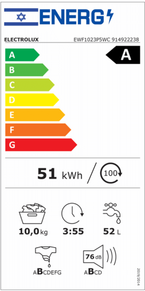 צריכת מים, חשמל וזמן לתוכנית כותנה אקו 40-60°C ,8 ק”ג : 52 ליטר, 0.84 קוט”ש כ– 215 דקות