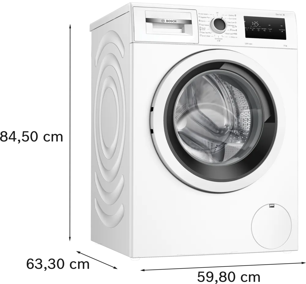 מכונת כביסה עצמאית (Free Standing) בצבע לבן, מבית Bosch – שילוב של עוצמה, נוחות ותוצאות ניקוי מושלמות. מתאימה במיוחד למשפחות, עם קיבולת נדיבה של 9 ק”ג, תוף בנפח 65 ליטר ומנוע חסכוני ושקט EcoSilence Drive.