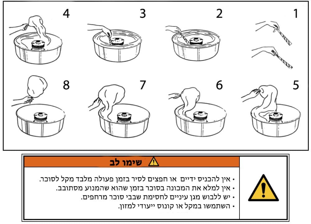 - הפעילו את המכונה והמתינו להתחלת יציאת צמר הגפן המתוק.