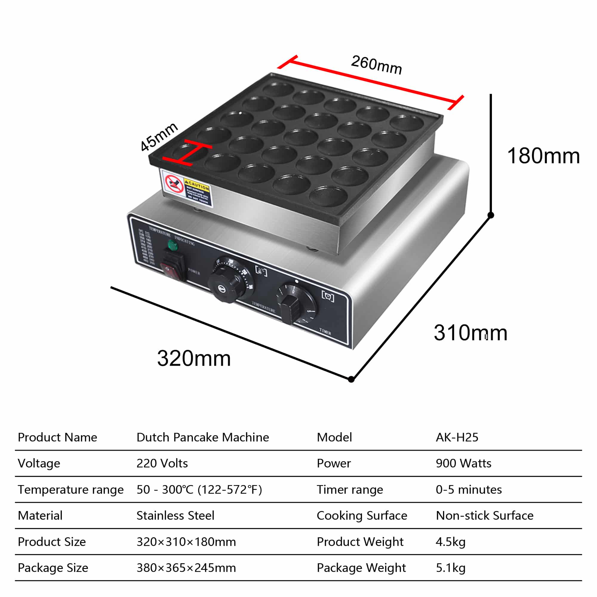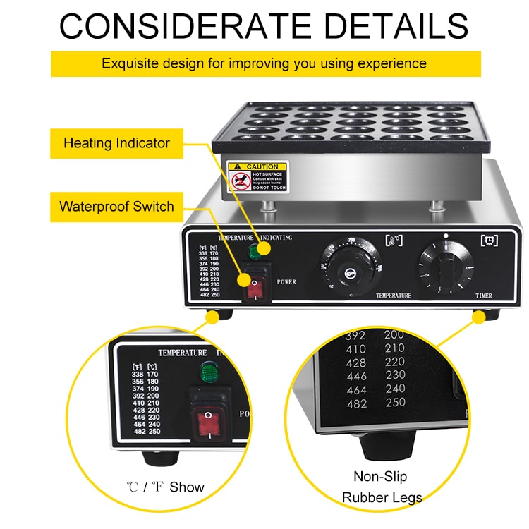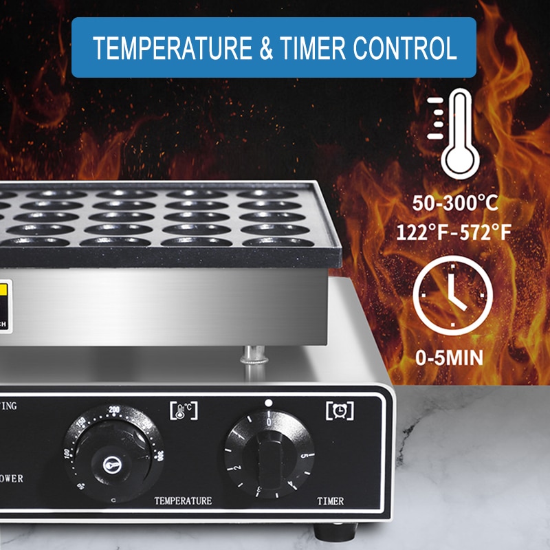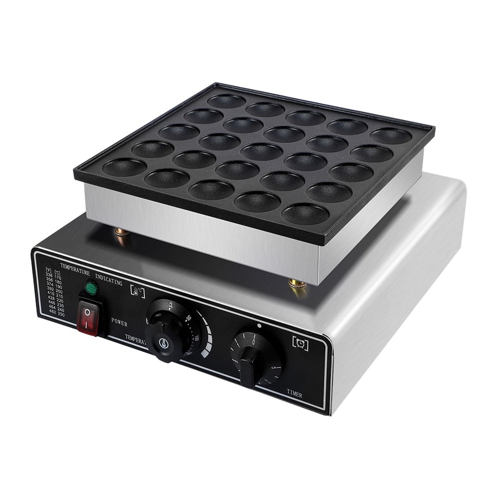 מכונה מקצועית להכנת 25 פנקייקים הולנדיים (פשאפיש) במקביל, עם משטח נון-סטיק, טווח טמפרטורה של 50°C עד 300°C, וכפתורים עמידים למים לניקוי קל. אידיאלית למסעדות, גלידריות ודוכני מזון.