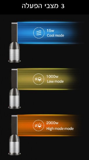 המפזר בעל גוף חימום קרמי איכותי עם 3 מצבי הפעלה: בינונית 1000W, גבוה 2000W ואיוורור 15W.