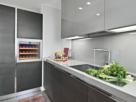 מדפי העץ הנשלפים מקנים למקרר היין מימד נוסף של יופי והדר.