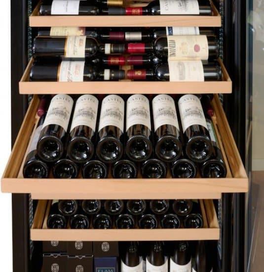 מדפי עץ מרווחים במיוחד, עמוקים ונשלפים, מאפשרים אחסון של כל סוג בקבוק וגישה נוחה לכל הבקבוקים, מתוכם חמישה (5) מדפי VinoView להצגה חזיתית של תוויות היין של בקבוקים מובחרים.