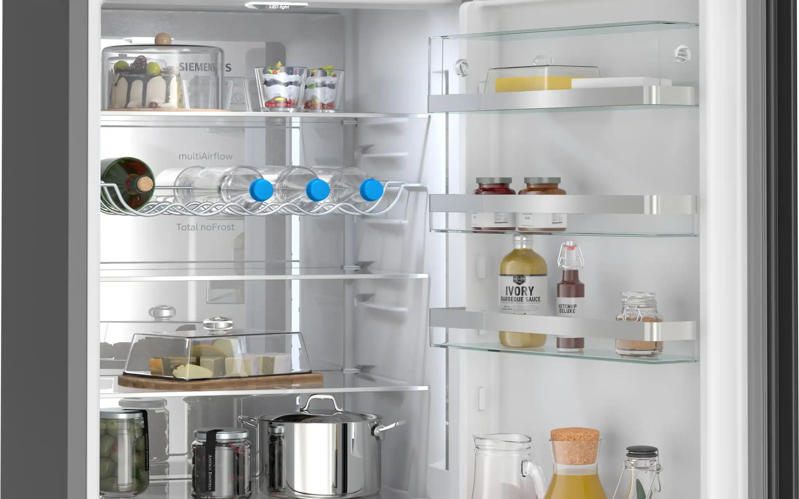 מקרר Siemens iQ700 עם מקפיא תחתון מציע שילוב מושלם של עיצוב פרימיום, קיבולת מרשימה וטכנולוגיה חכמה לשמירה על טריות המזון לאורך זמן. עם גימור Black Matt אלגנטי וטכנולוגיית Total NoFrost, אין צורך בהפשרה ידנית – המזון נשמר טרי והקירור שומר על יעילות אנרגטית מקסימלית.
