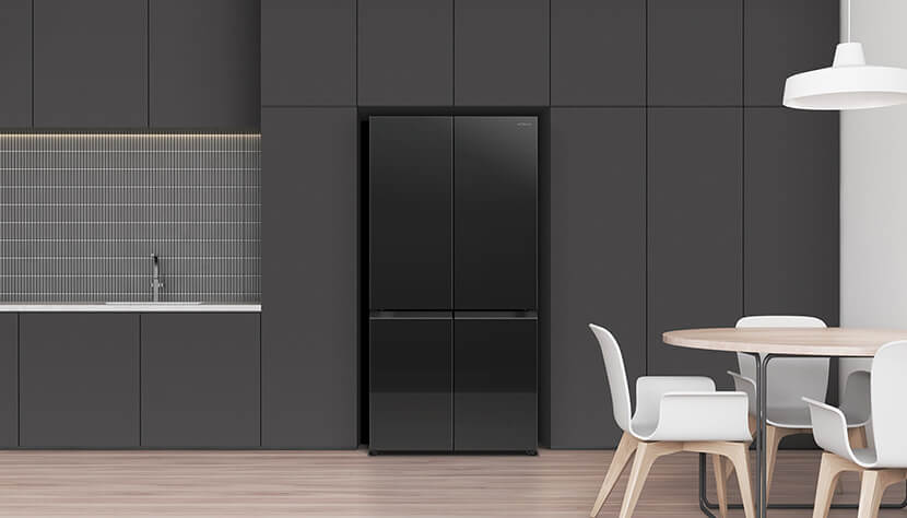 מקרר הדגל של HITACHI, בעיצוב זכוכית שחורה יוקרתית, מציע פתרון אידיאלי למשפחות שאוהבות מרחב, סדר וטכנולוגיה. ארבע דלתות מעוצבות מעניקות גישה נוחה לכל חלק במקרר והופכות אותו לאלמנט עיצובי של ממש במטבח.