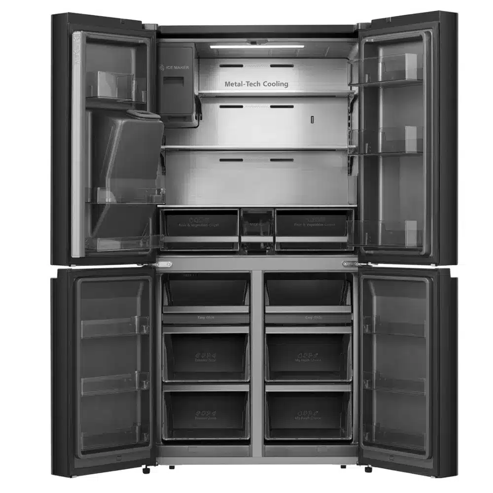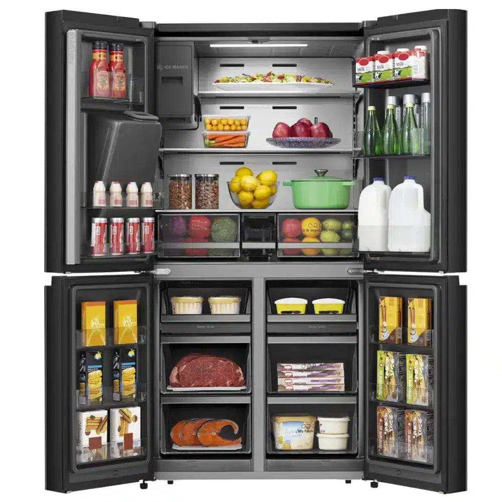 המקרר Hisense RQ760N4SBFE מבית הייסנס מציע עיצוב מרהיב בסגנון אמריקאי עם ארבע דלתות, נפח אחסון מרווח של כ־584 ליטר ברוטו (427 ל’ נטו), מקפיא תחתון ותכונות חדשניות – לשמירה אופטימלית על המזון ולנוחות שימוש יומיומית.