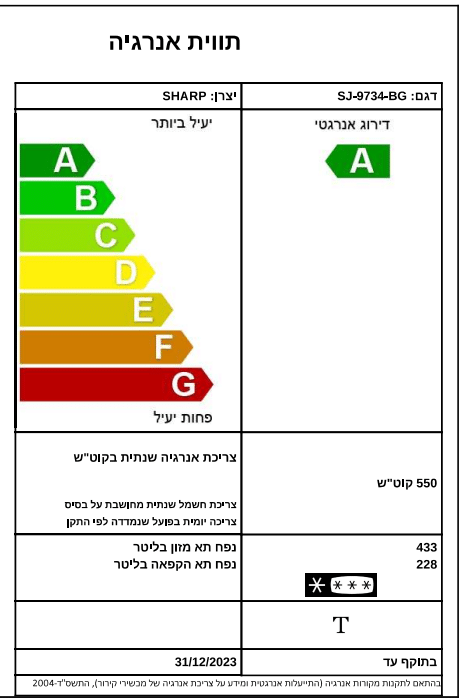 נפח אחסון (נטו) תא קירור: 433 ליטר
