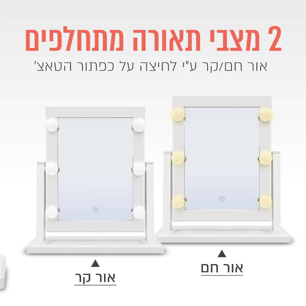 ניתן להחליף בין שני מצבי תאורה אור חם/קר ע”י לחיצה על כפתור הטאצ’ – מאפשר להתאפר גם בחדר חשוך מבלי להפריע לאחרים