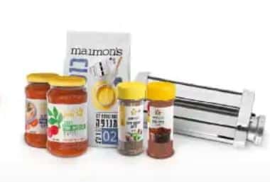 המארז כולל: מרדד פסטה, קמח מנופה, 2 צנצנות רטבים, 2 בקבוקי תבלינים של חב’ מימון עם עלון של מתכונים וטיפים.