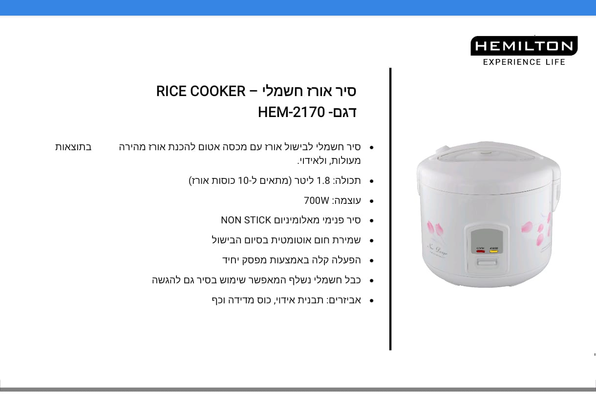 סיר לאידוי אורז 1.8 ליטר המילטון דגם – HEM-2170