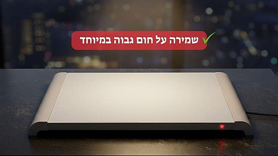 במידות 40X77 ס”מ, עם משטח חימום פעיל בגודל 40X60 ס”מ.