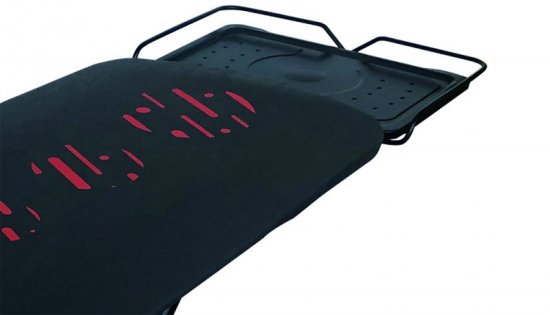משטח גיהוץ ענק ורחב במיוחד העשוי רשת ברזל (כוורת) לצורך מעבר אדים רציף דרך המשטח ובעל כיסוי בד איכותי ועמיד בחום העשוי כותנה בעובי 10 מ”מ.