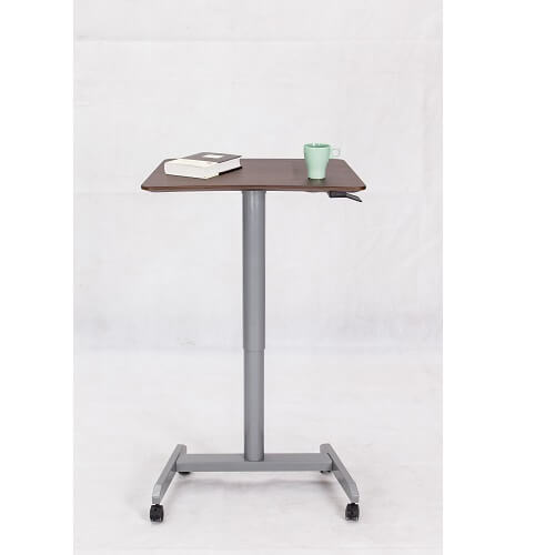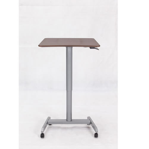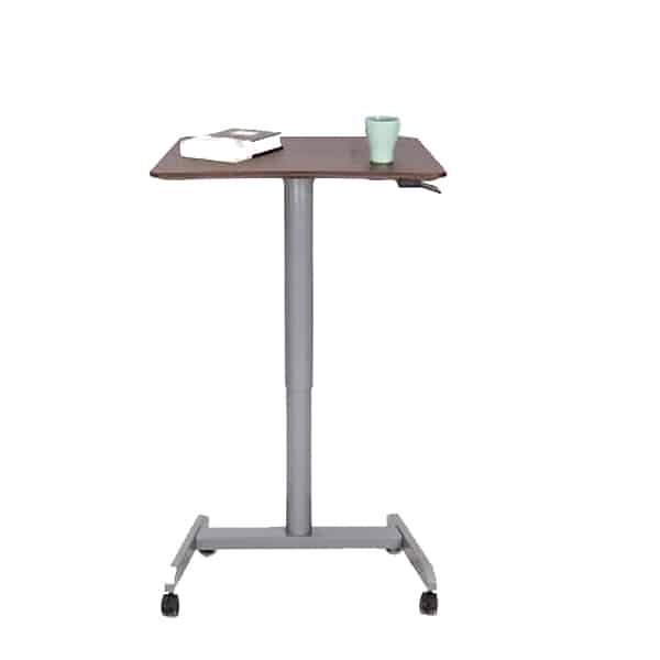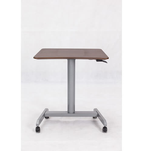 שולחן פנאומטי מיני מתכוונן בעל מנגנון פנאומטי, עם פלטה מחומר MDF בציפוי PVC. לשולחן רגל אלומיניום בצבע אפור ופלטה בצבע עץ טבעי.