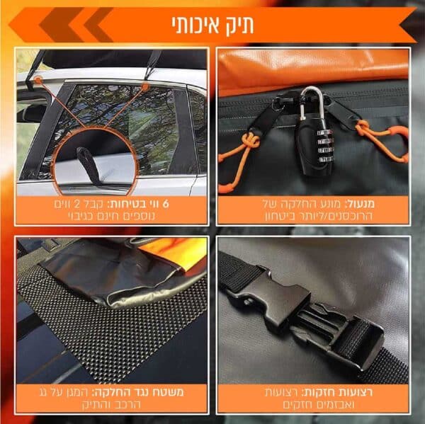 • אבטחה מרבית – מגיע עם 10 רצועות חזקות מובנות ו-6 לולאות נוספות כדי להבטיח שהכל נשאר במקום. בנוסף מגיע עם מנעול מקודד לאבטחת המטען בצורה אישית ומרבית