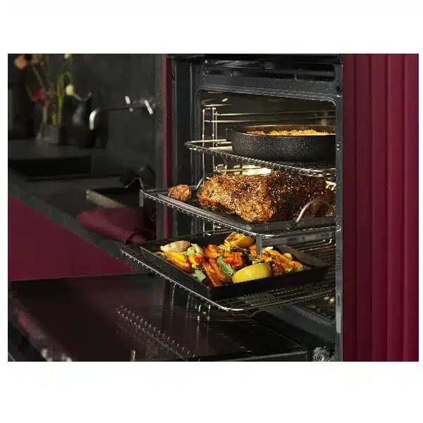 תנור בנוי יוקרתי בנפח 71 ליטר, עם תא אפייה גדול מסוג MAXIKLASSE, טורבו לפיזור חום אחיד, דלת בטיחותית עם 3 שכבות זכוכית ותוכנית ניקוי באדים. מתאים למשפחות ולמי שמחפש אפייה מקצועית בבית.